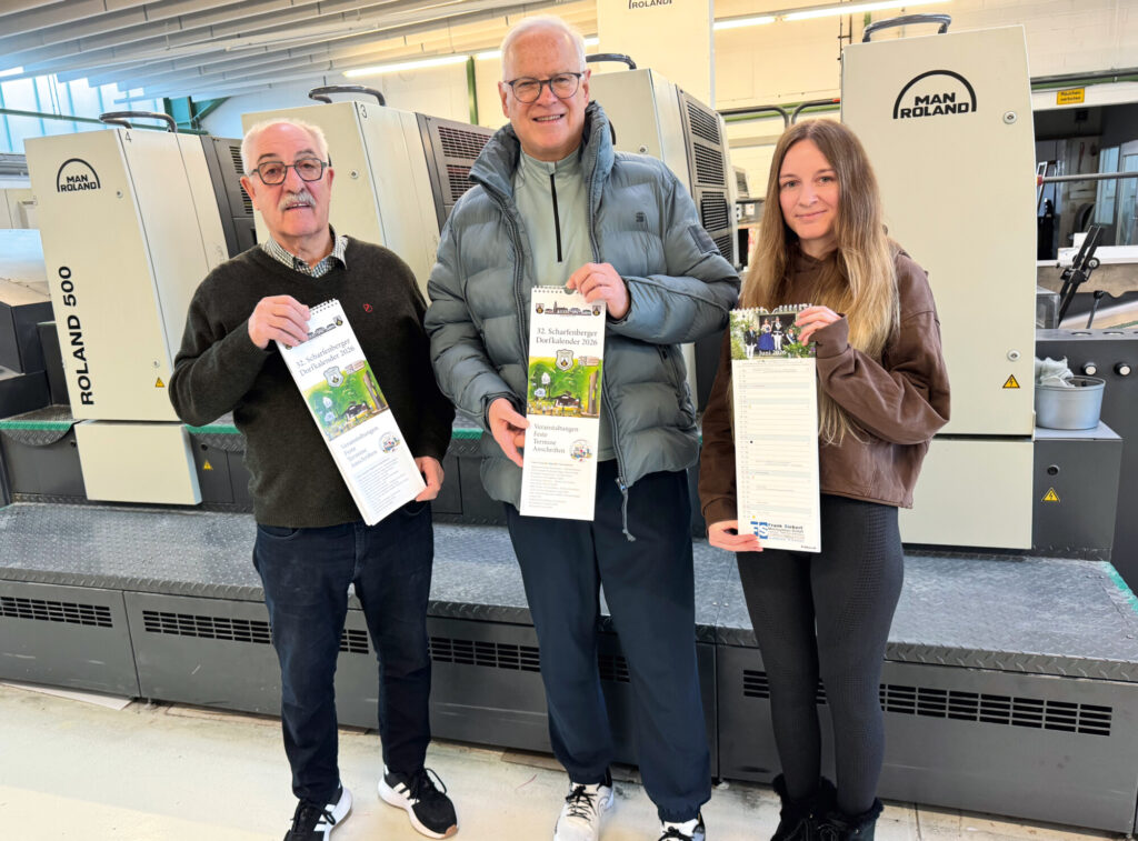Franz Josef Kemmerling (Geschäftsführer Satz & Druck Kemmerling GmbH) Lukas Wittmann (Ortsvorsteher) und Karina Gagelgants (Mediengestalterin) v.l.n.r
