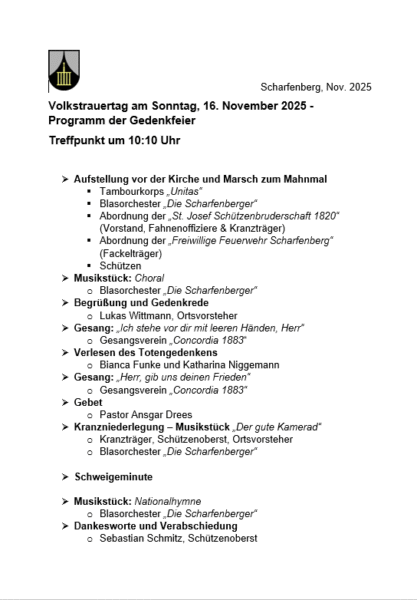 Im Anschluss an die Messe stellen sich die Musikvereine, die Schützenbruderschaft und die Freiwillige Feuerwehr vor der Kirche auf. Gemeinsam marschieren wir anschließend zum Mahnmal, wo die Gedenkfeier fortgesetzt wird.