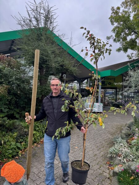 Wir sind zusammen mit den Kindern, in eine Briloner Gärtnerei gefahren, haben uns umgeschaut und beraten lassen. Die gemeinsame Wahl fiel auf einen Birnenbaum. Da wir einmal in Brilon waren, schauten wir uns gemeinsam den Aufbau der Michaeliskirmes an und besuchten danach gemeinsam einen Imbiss. „Heute kocht Mona mal nicht.“ Dafür war nach dem Besuch in Brilon noch genug Zeit, den Baum gemeinsam einzupflanzen.