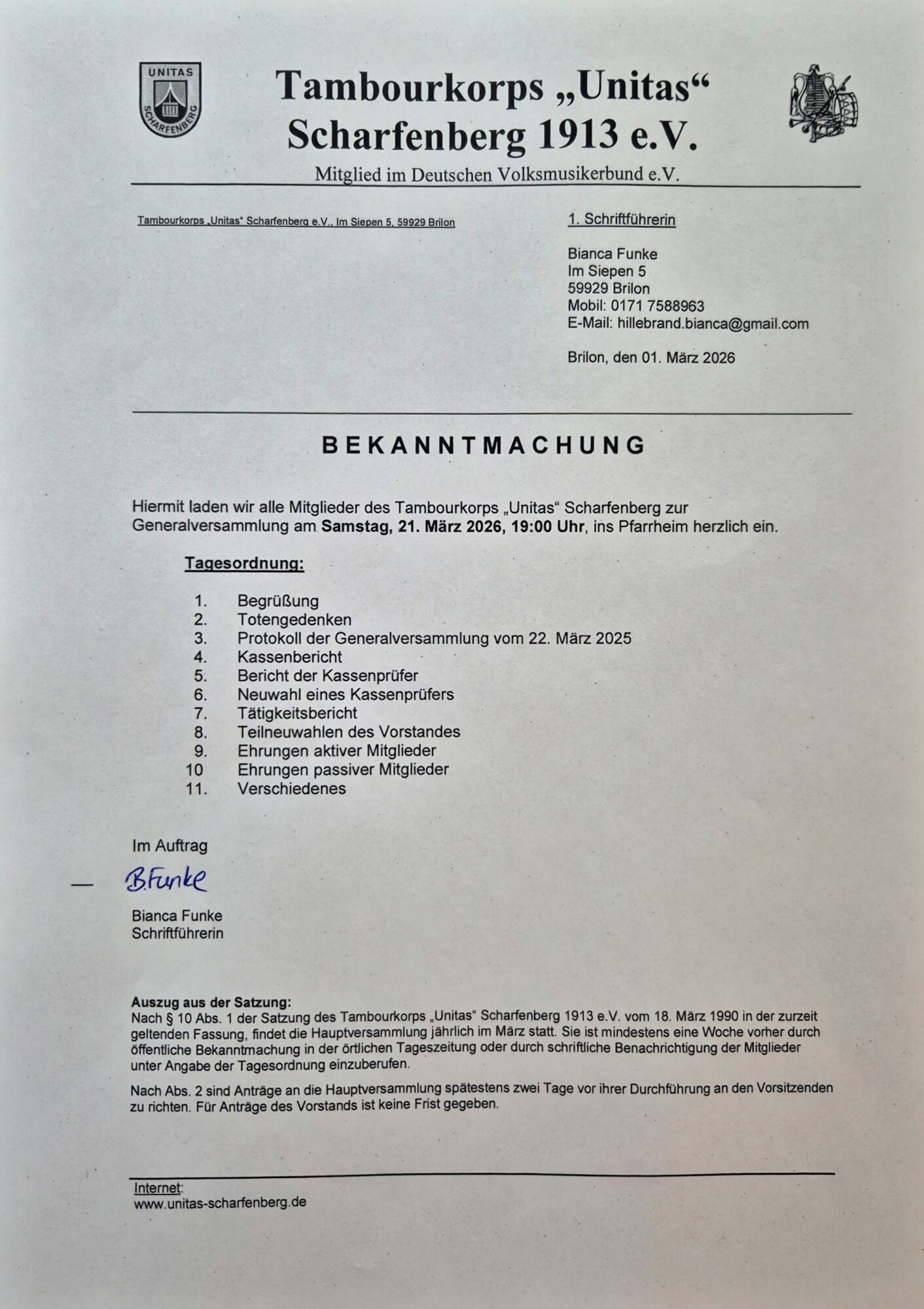 Einladung Generalversammlung Tambourkorps Unitas Scharfenberg 2026